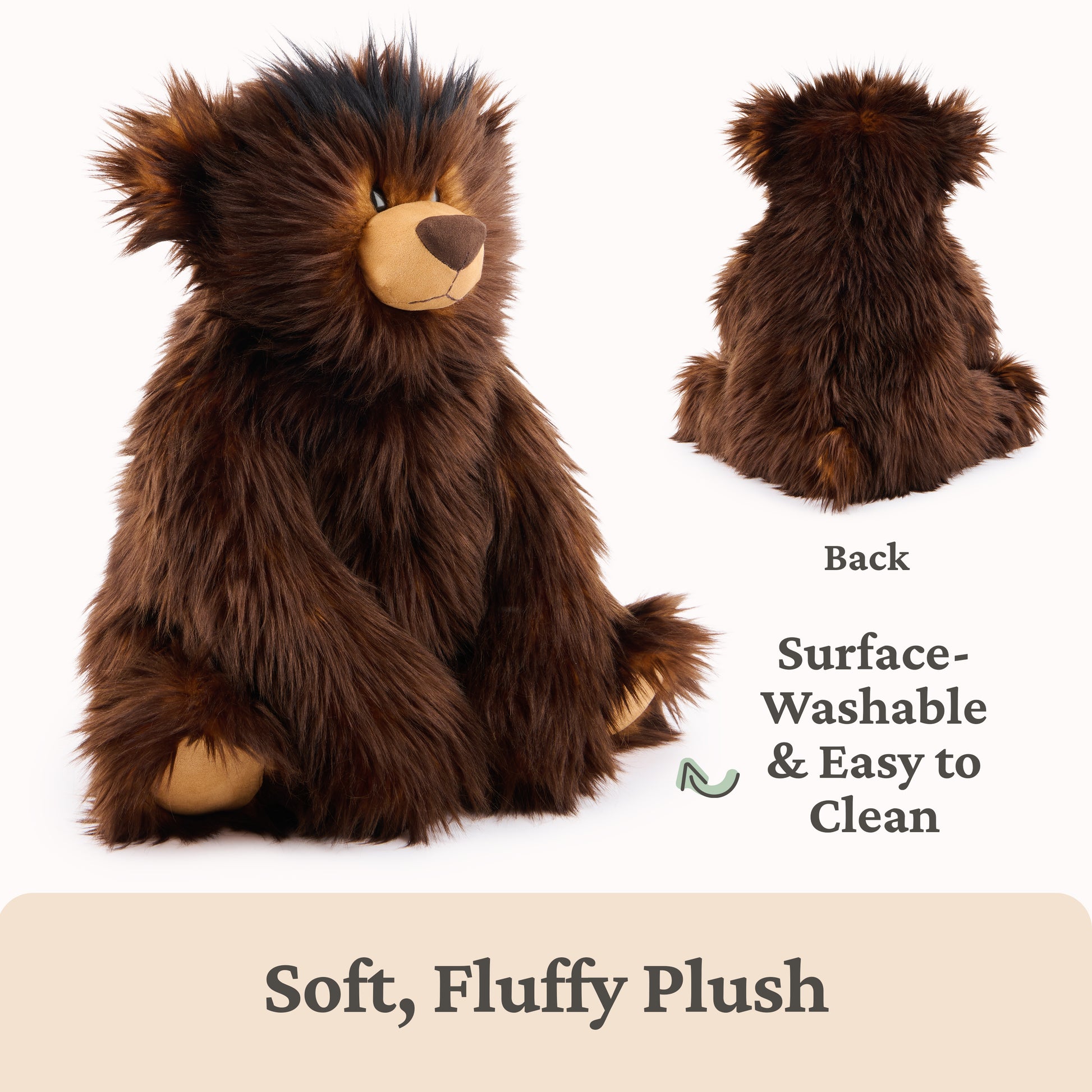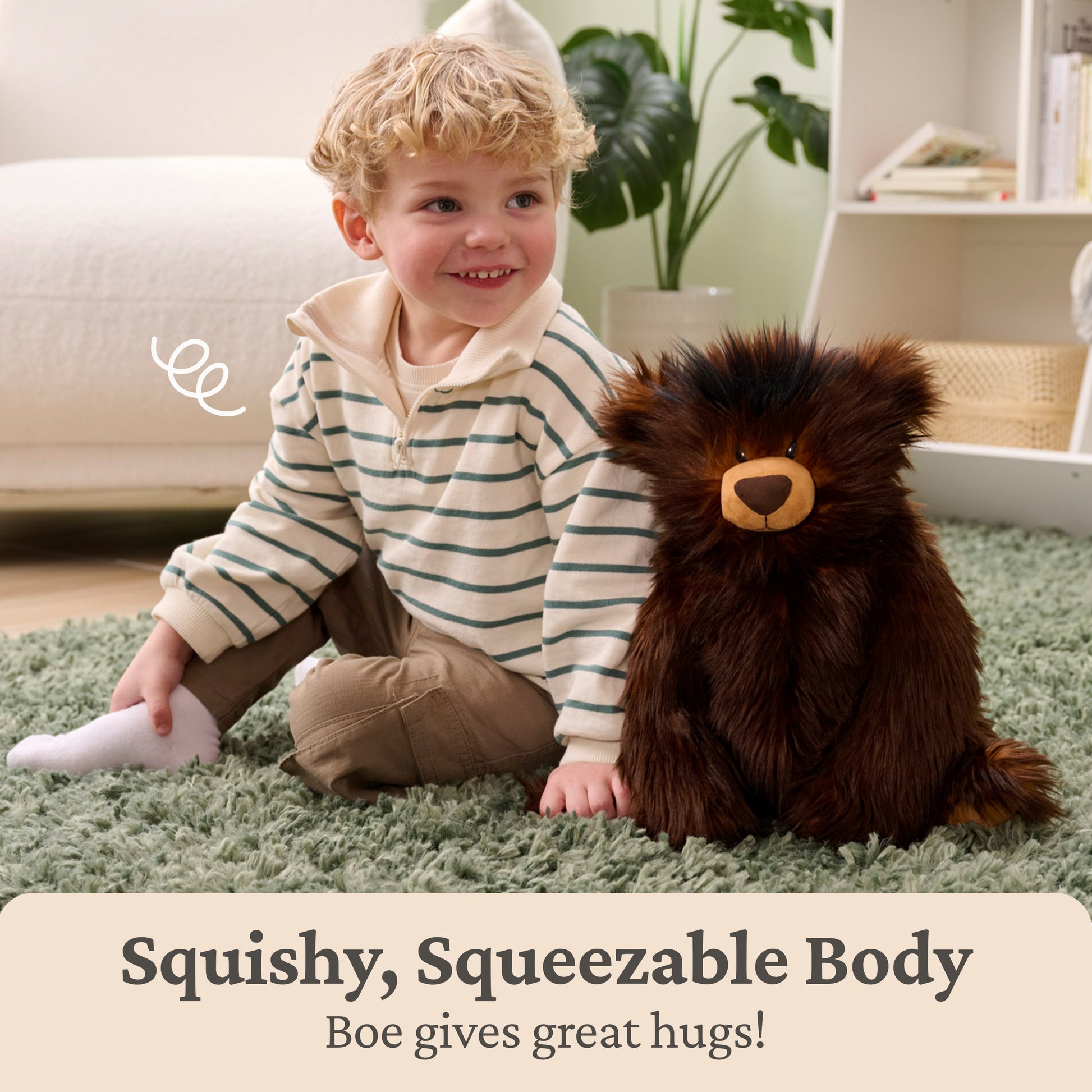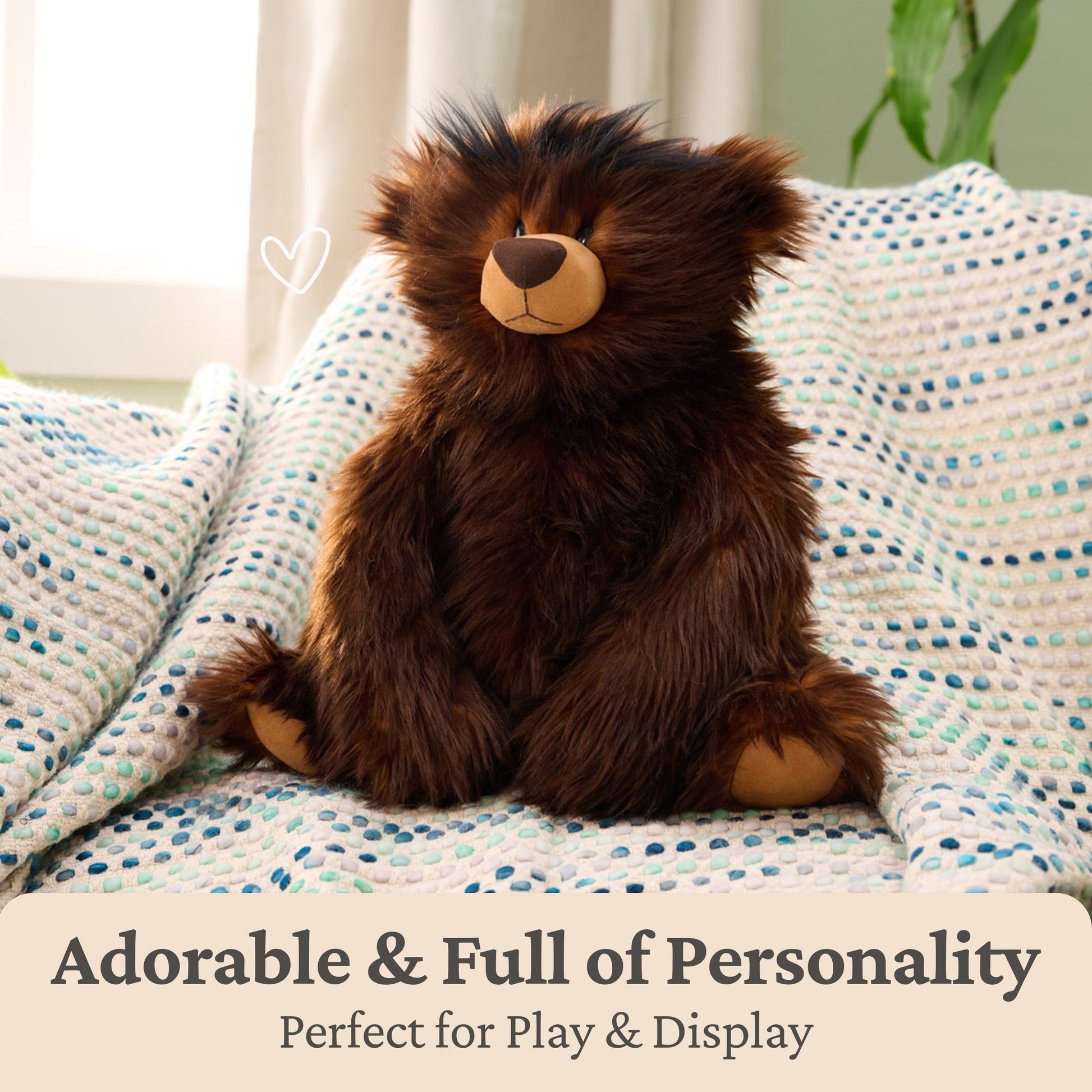 This extra-fluffy 12” bear has thick, multi-hued brown plush and a sophisticated faux suede muzzle with paw pads to match. This gentle giant also has larger-than-life proportions, including oversized, easy-to-grab paws and long, floppy arms. Boe’s whispy, high-pile fur has several plush shades, ranging from a lighter sandy tan to deeper chocolate and dark black-brown hues. His earnest expression and eager forward-leaning pose tell you just how much he wants a big squeeze from his best friend!