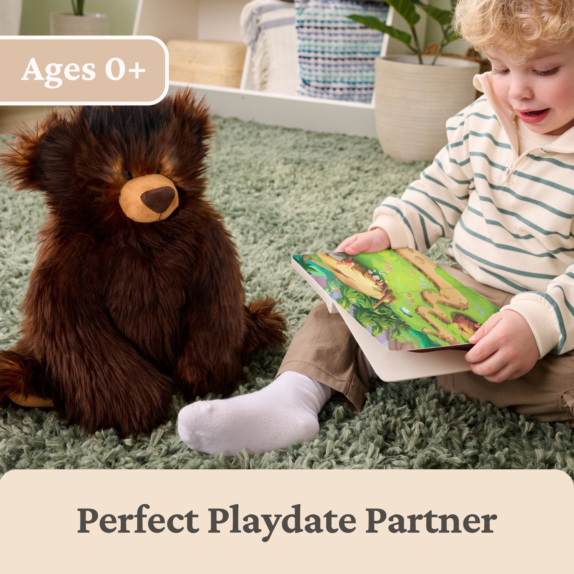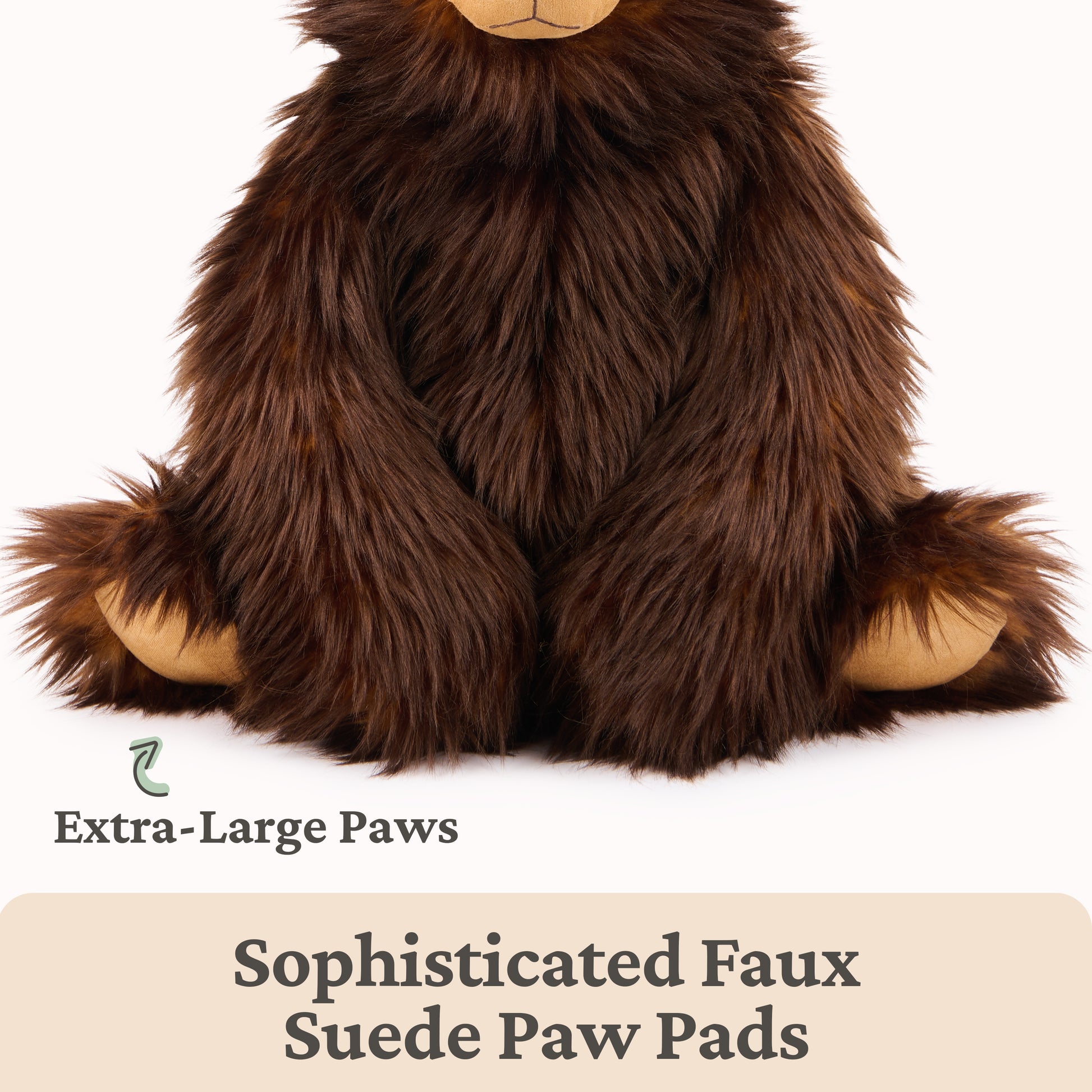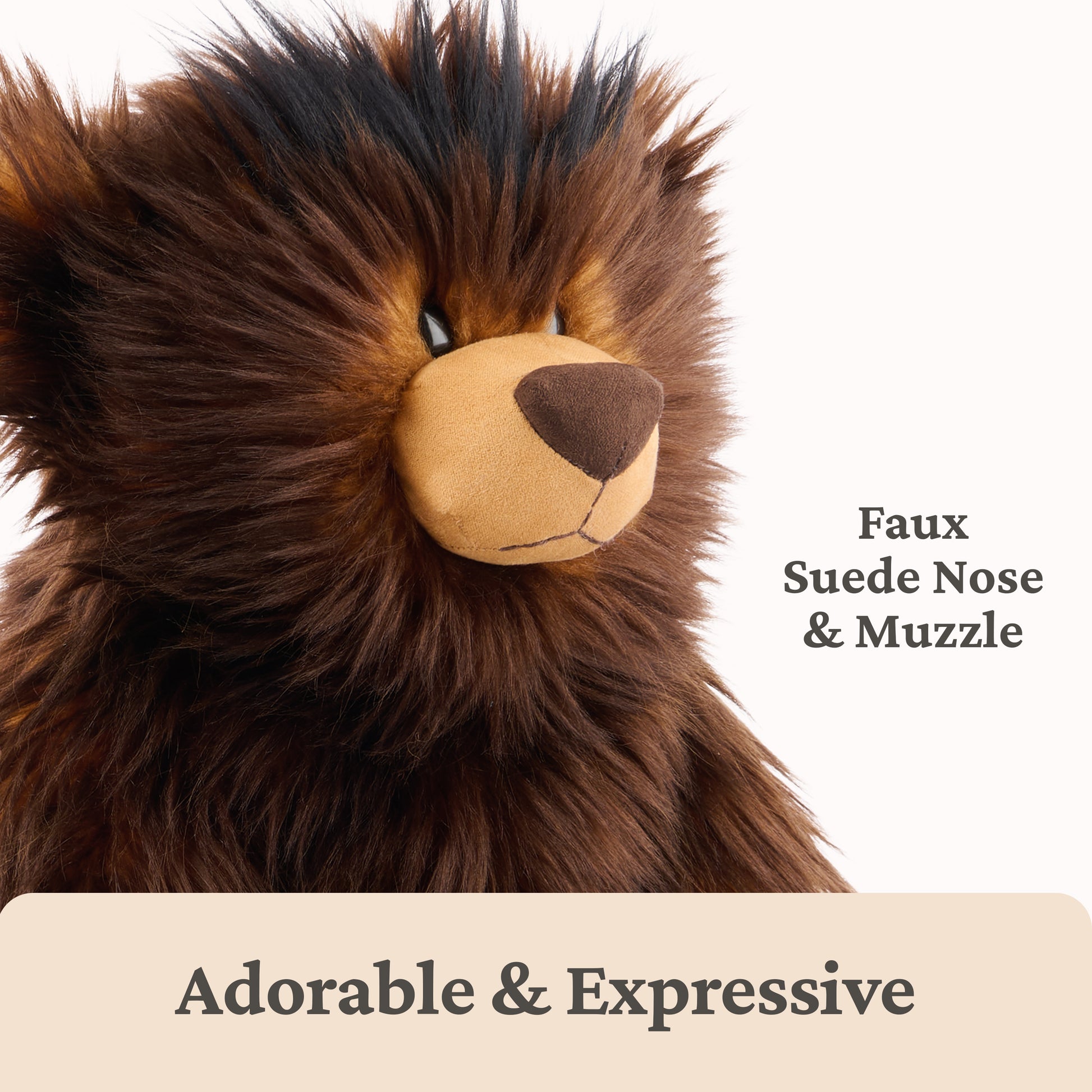 This extra-fluffy 12” bear has thick, multi-hued brown plush and a sophisticated faux suede muzzle with paw pads to match. This gentle giant also has larger-than-life proportions, including oversized, easy-to-grab paws and long, floppy arms. Boe’s whispy, high-pile fur has several plush shades, ranging from a lighter sandy tan to deeper chocolate and dark black-brown hues. His earnest expression and eager forward-leaning pose tell you just how much he wants a big squeeze from his best friend!