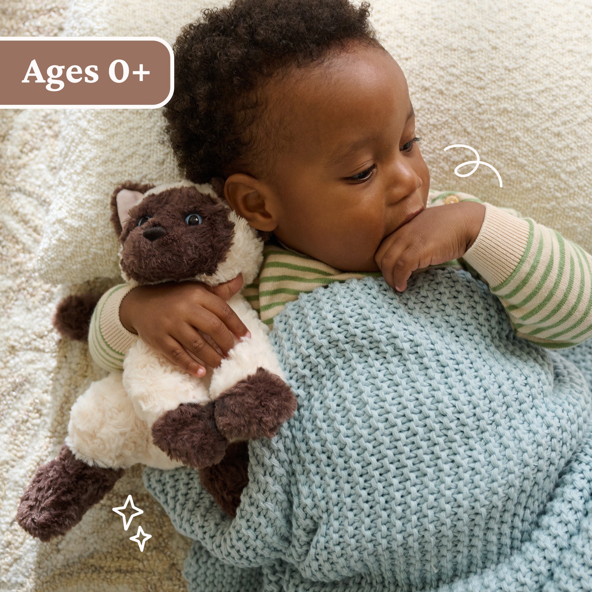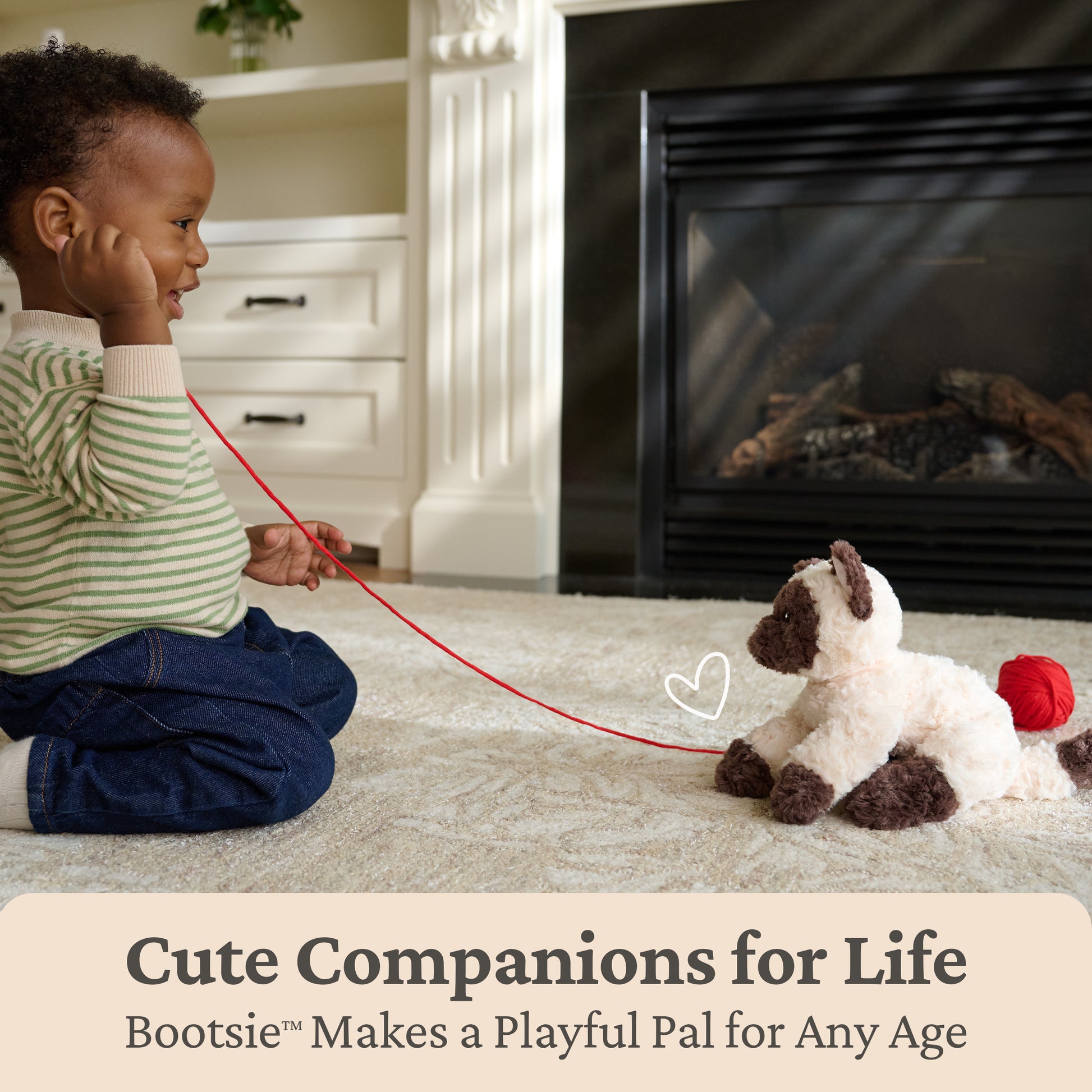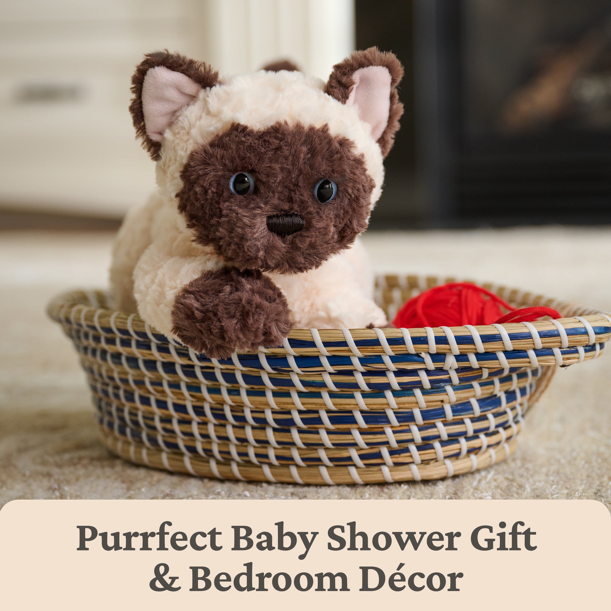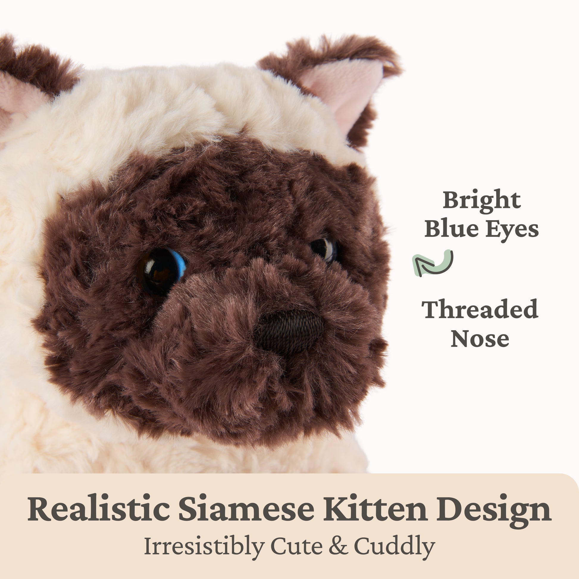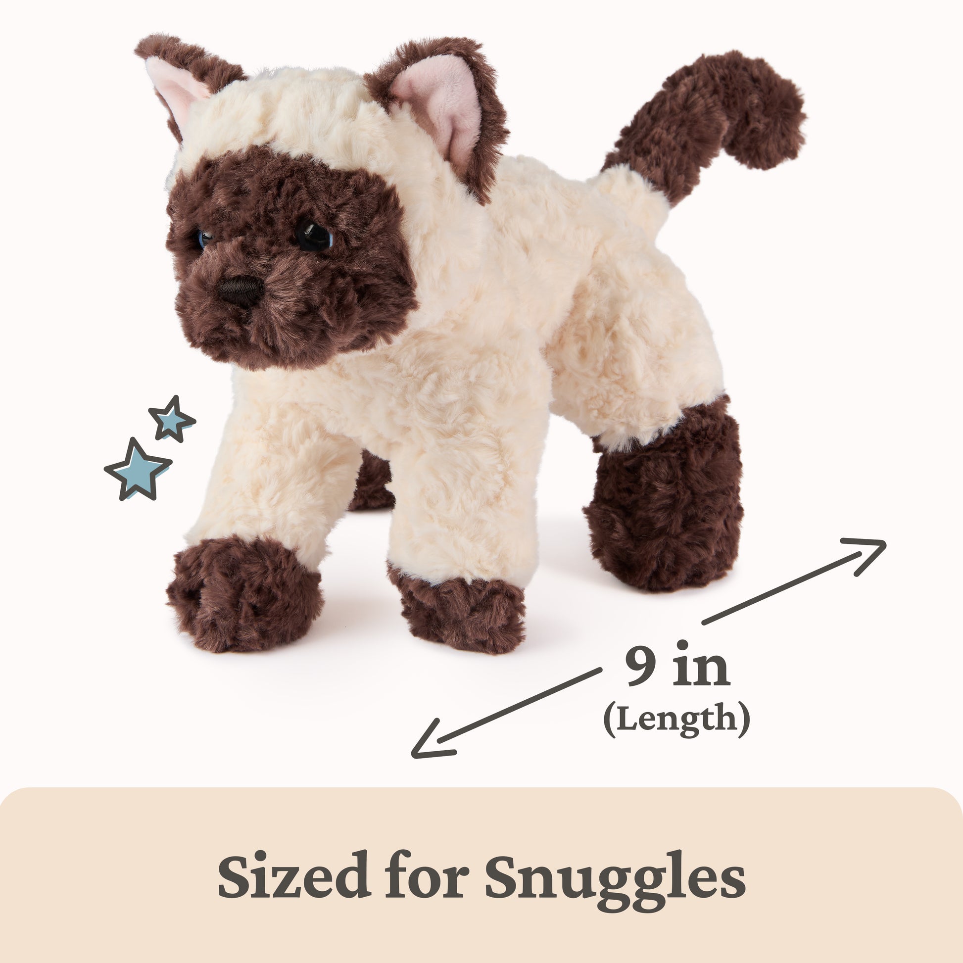 From cuddles to nose boops, Bootsie can’t wait to be your best friend! This precious Siamese cat boasts bright blue eyes, soft, cream-colored plush, and distinct chestnut accents on its paws, curled tail, ears, and face. Bootsie also features a threaded chocolate-brown nose and soft, thick swirls of plush fur. Bootsie sits on all fours in a pounce-ready pose, ready to play, snuggle in the crook of your arm for a good cuddle, or pose charmingly with its bean-filled paws. At 9 inches from paw to paw, this sweet, soft, bright-eyed kitten is also sized for big and little hands alike, meaning it’ll be there for bedtime cuddles, long car rides, and everywhere in between.