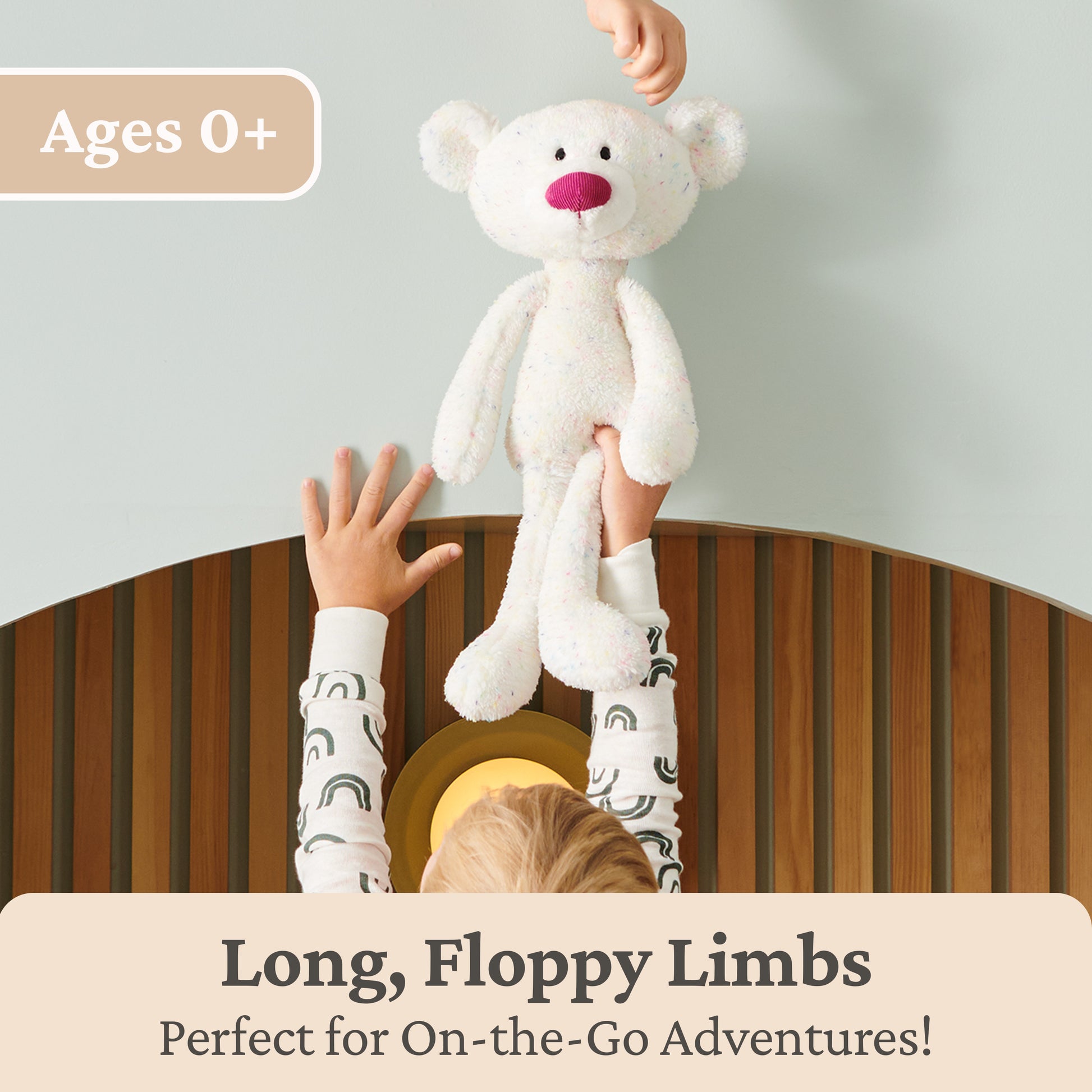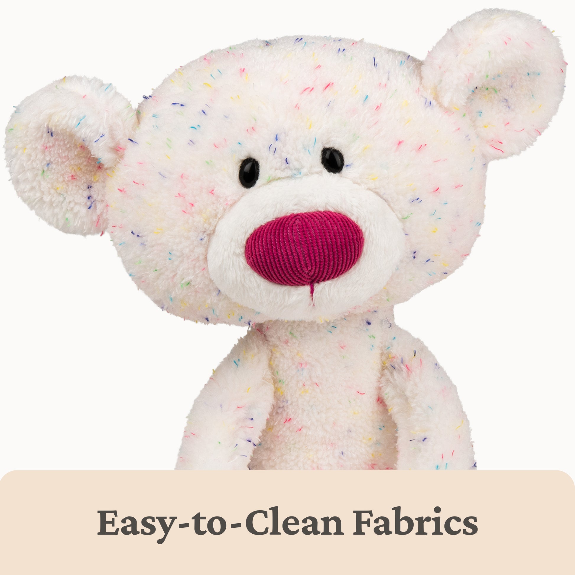 The party goes wherever Confetti goes! Every day is worth celebrating when Toothpick is around, and when this bear covers his fur in confetti, everyone knows they’re about to have a great time. Just throw this colorful beat in the air and let the good times rain down! This 15” cream-colored teddy bear features a colorful rainbow-speckled pattern, a bright pink nose, and a slender body with playfully floppy limbs.