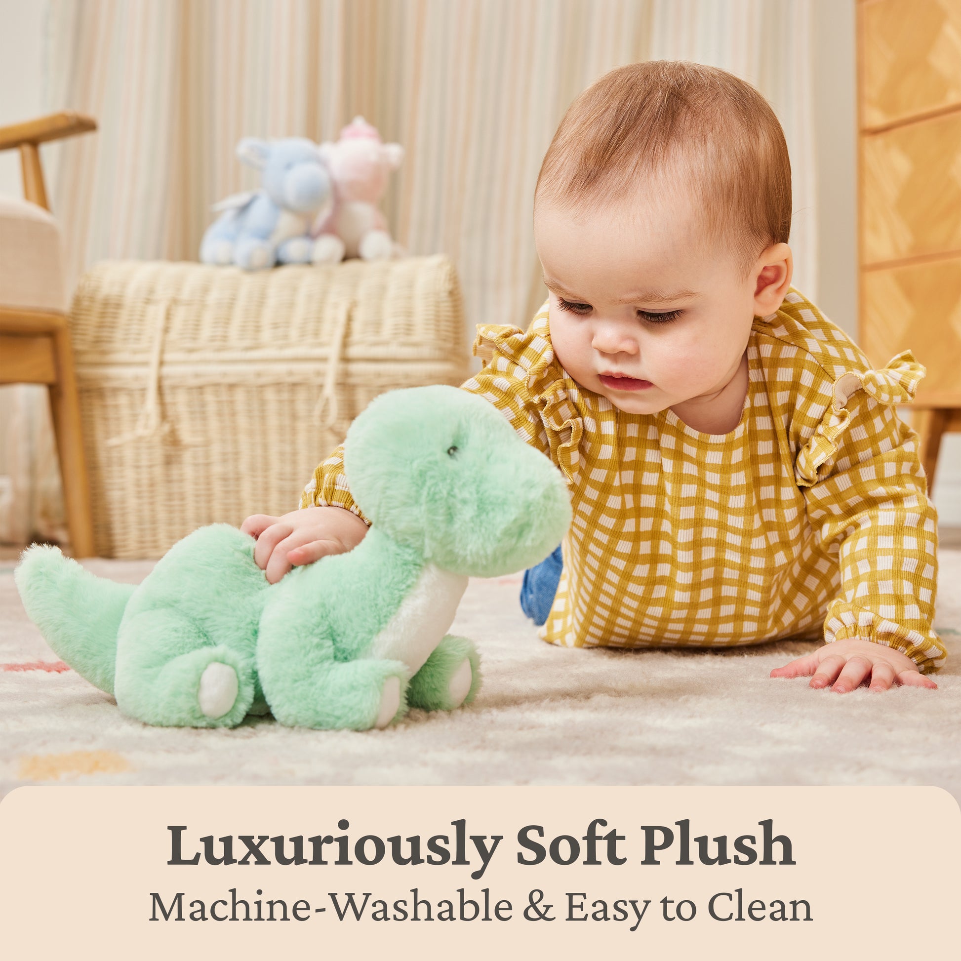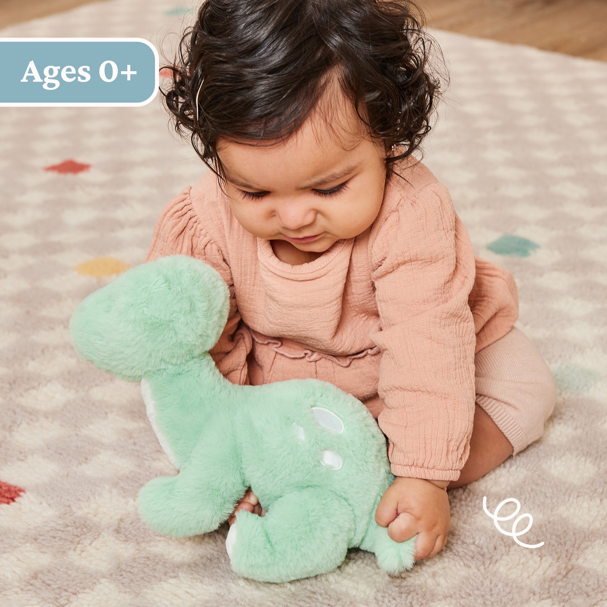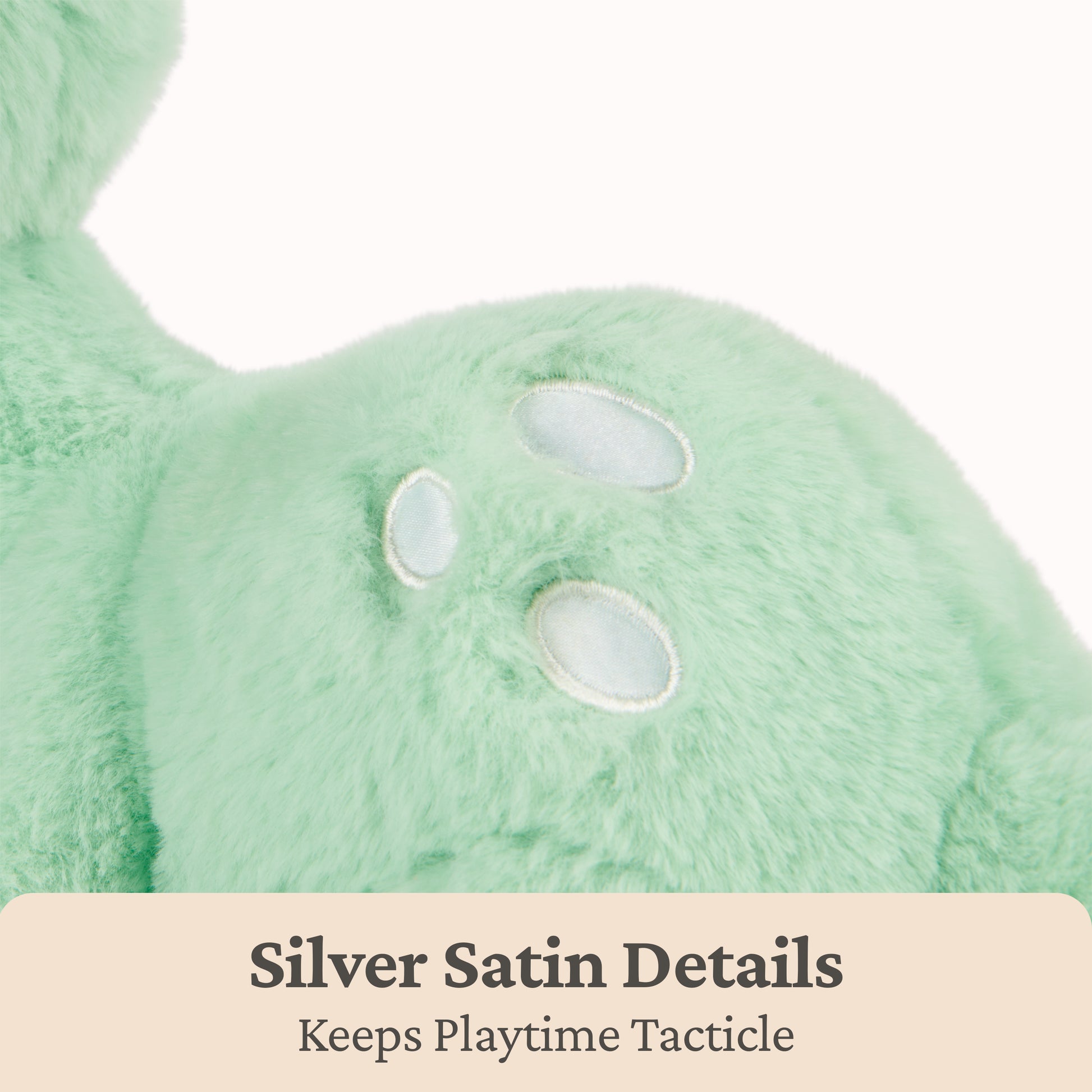 This adorable and slightly floppy 10” green dinosaur relaxes in a playful downward pose, ready to snuggle or snooze with baby. Fern features embroidered details, luxuriously soft fabric, and shiny silver satin spots that keep playtime tactile.
