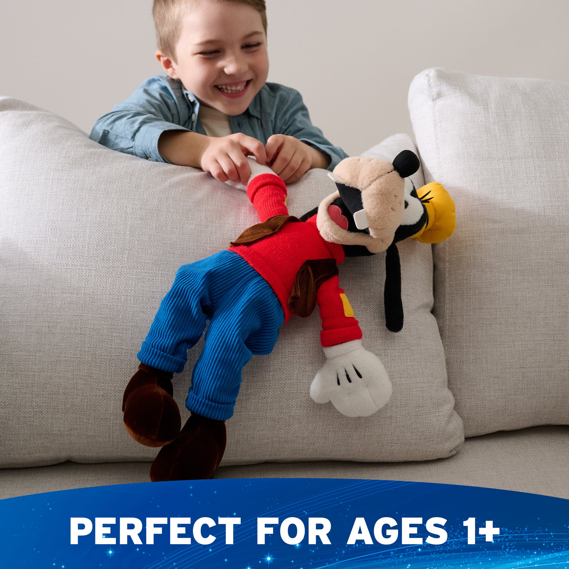 “All you need is a little bit of magic.” Mickey Mouse and his best pals are here in the latest Disney collection by GUND, boasting adorable classic designs for play and display to kids and collectors alike. This 14” plush features Disney’s Goofy dressed in his signature outfit with deluxe materials including blue corduroy pants, a soft knitted red turtleneck sweater with yellow elbow patches, a velvety chocolate-brown vest, and matching shoes. Goofy also has long, floppy black ears and a yellow hat with black satin lining. This silly character is known for his distinct laugh and endearing personality, and this expressive plush toy’s extra-large smile will brighten anyone’s day!