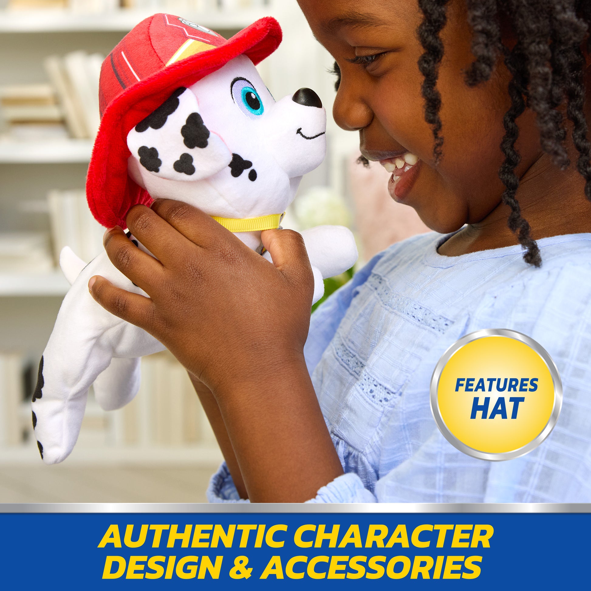 Marshall is all fired up and ready for adventure – or a relaxing snooze – as an adorable lounging plush! This soft, cuddly plush features the goofy and brave PAW Patrol firefighter pup in his signature red-and-yellow helmet and badge, secured by a yellow satin ribbon collar. Marshall has soft white plush with black spots, a plastic nose, and a cuddly, squeezable body weighted with pellets for a fun textural sensory experience. A convenient 8” size also makes on-the-go play easy, so your little one can bring their favorite character (or even the whole pack) to save the day on the next playtime rescue mission! Collect them all, including Chase, Skye, Marshall, and Rubble beanbag styles.