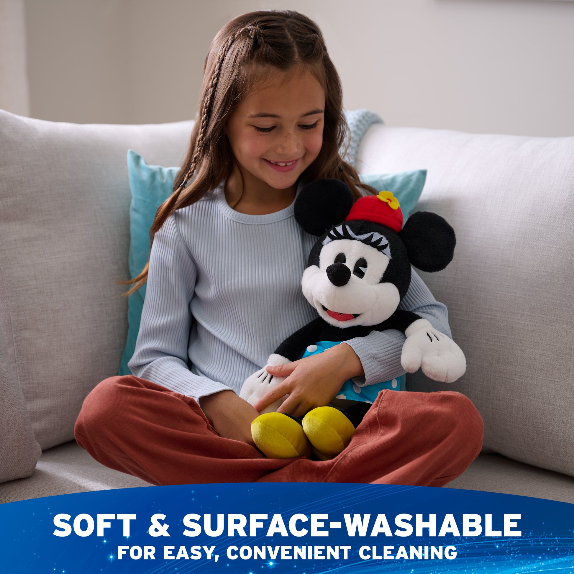 “All you need is a little bit of magic.” Mickey Mouse and his best pals are here in the latest Disney collection by GUND, boasting adorable classic designs for play and display to kids and collectors alike. This 14” plush shows Disney’s Minnie Mouse, Mickey’s sweetheart, dressed to the nines in deluxe fabrics. Her stylish outfit includes a light blue polka-dot satin skirt, soft yellow velvet heels, white lace-detailed bloomers, her iconic white gloves, a long, slender, and floppy tail, and an adorable red felt cap with a yellow flower. Her long eyelashes and nose are both made of a soft faux suede fabric. This cheerful, affectionate sweetie brings cuddly magic to playtime with soft black and white plush that makes her irresistibly huggable.