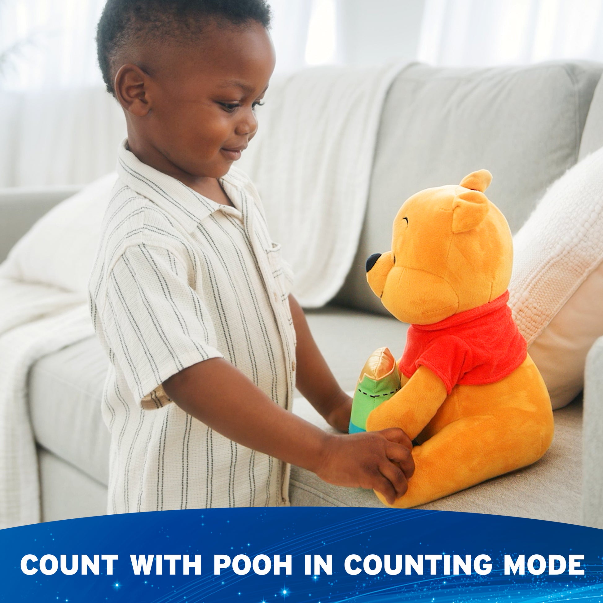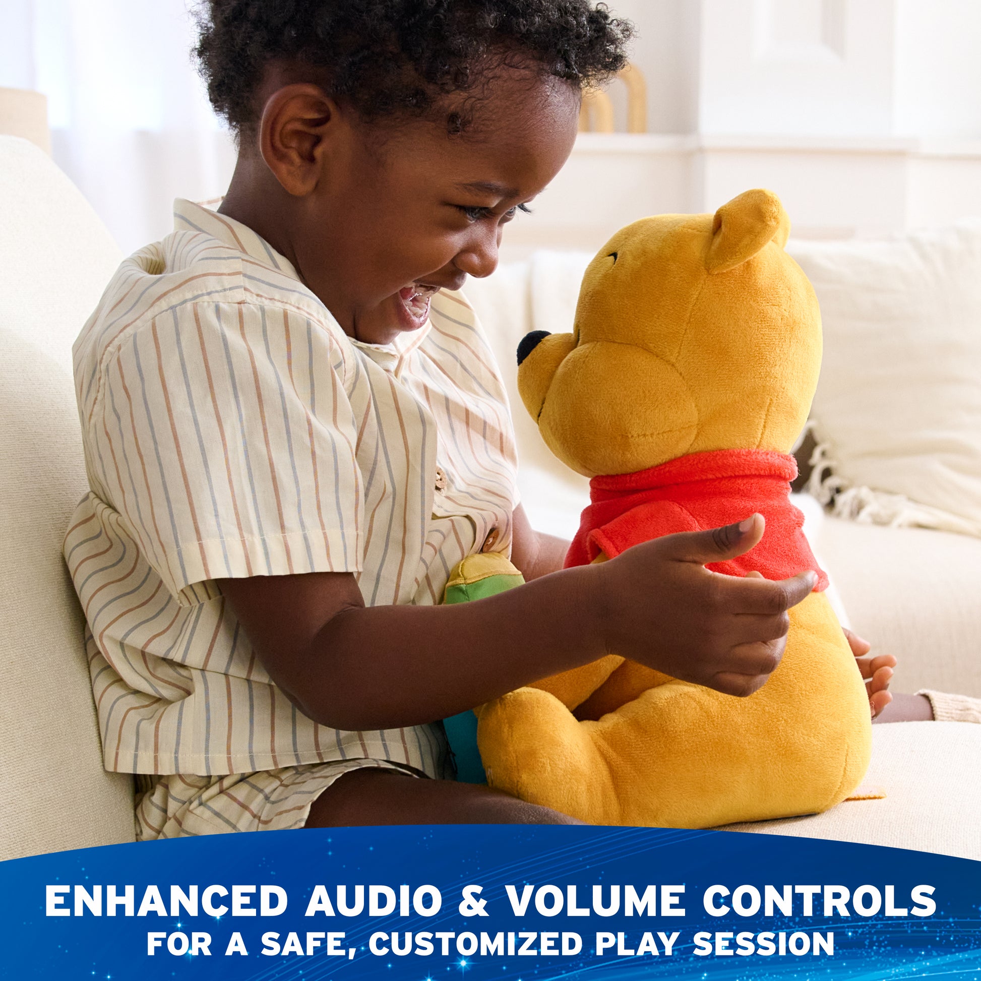 Pooh Bear has a rumbly in his tumbly! Disney’s Winnie the Pooh is joining the play date to teach your little one how to count and play peek-a-boo! This soft 11” seated stuffed animal features Winnie the Pooh looking as cuddly and adorable as ever, designed with show-accurate details such as a huggable body, soft amber plush, and a velvety red t-shirt. Pooh holds a bright green honeypot in his hands, which is also detailed with a splash of gold embroidered honey for extra tactile fun. Using the switch on his bottom, parents can wake Pooh Bear up to engage with their little ones in an interactive peek-a-boo game or teach them to count to three as he counts sips of honey! Pooh raises and lowers his arms as he clutches the honeypot playfully and hides his face, surprising babies each time. This innovative plush features over 20 whimsical phrases to provide exciting, unique playdates and includes volume controls for a safe, comfortable, and customized play session each time. (See hangtag for details and instructions.) Elevate everyday play with everyone’s favorite silly ol’ bear from the Hundred Acre Wood!