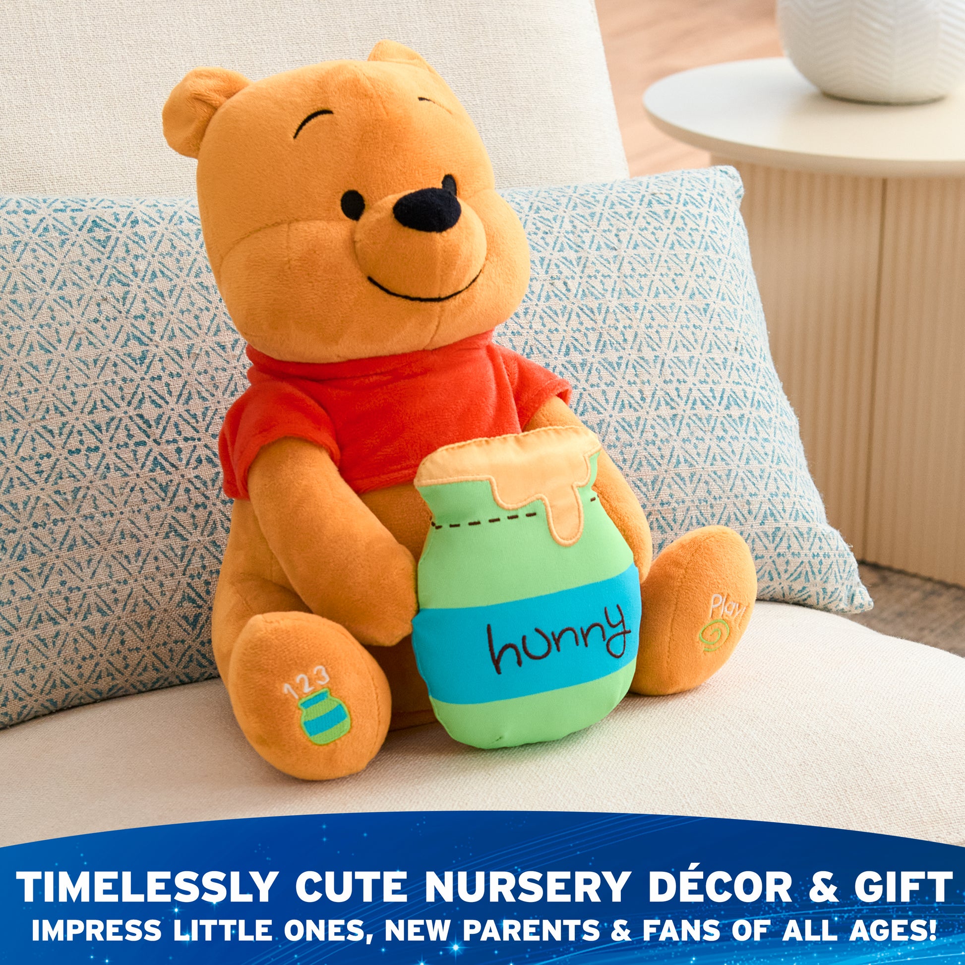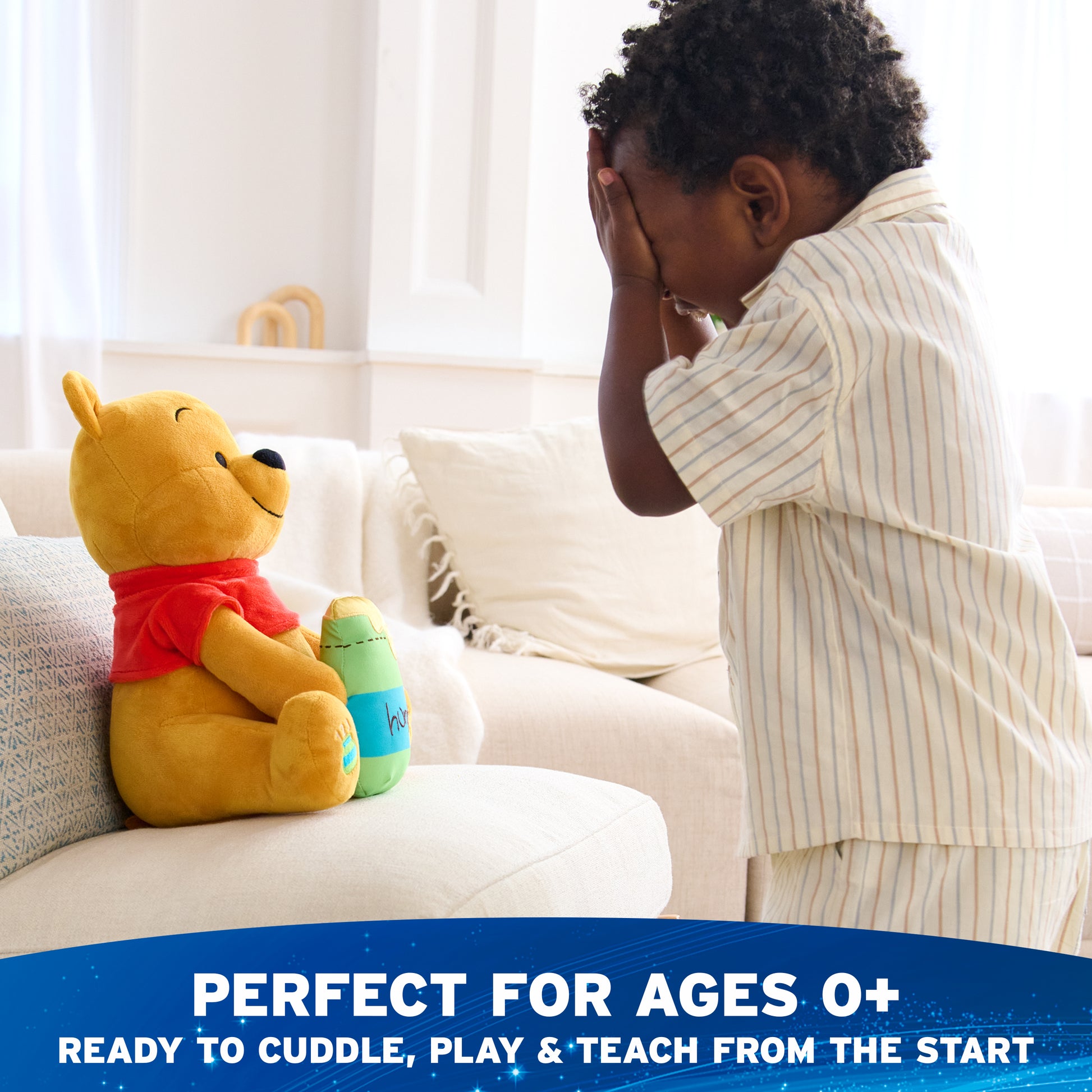 Pooh Bear has a rumbly in his tumbly! Disney’s Winnie the Pooh is joining the play date to teach your little one how to count and play peek-a-boo! This soft 11” seated stuffed animal features Winnie the Pooh looking as cuddly and adorable as ever, designed with show-accurate details such as a huggable body, soft amber plush, and a velvety red t-shirt. Pooh holds a bright green honeypot in his hands, which is also detailed with a splash of gold embroidered honey for extra tactile fun. Using the switch on his bottom, parents can wake Pooh Bear up to engage with their little ones in an interactive peek-a-boo game or teach them to count to three as he counts sips of honey! Pooh raises and lowers his arms as he clutches the honeypot playfully and hides his face, surprising babies each time. This innovative plush features over 20 whimsical phrases to provide exciting, unique playdates and includes volume controls for a safe, comfortable, and customized play session each time. (See hangtag for details and instructions.) Elevate everyday play with everyone’s favorite silly ol’ bear from the Hundred Acre Wood!