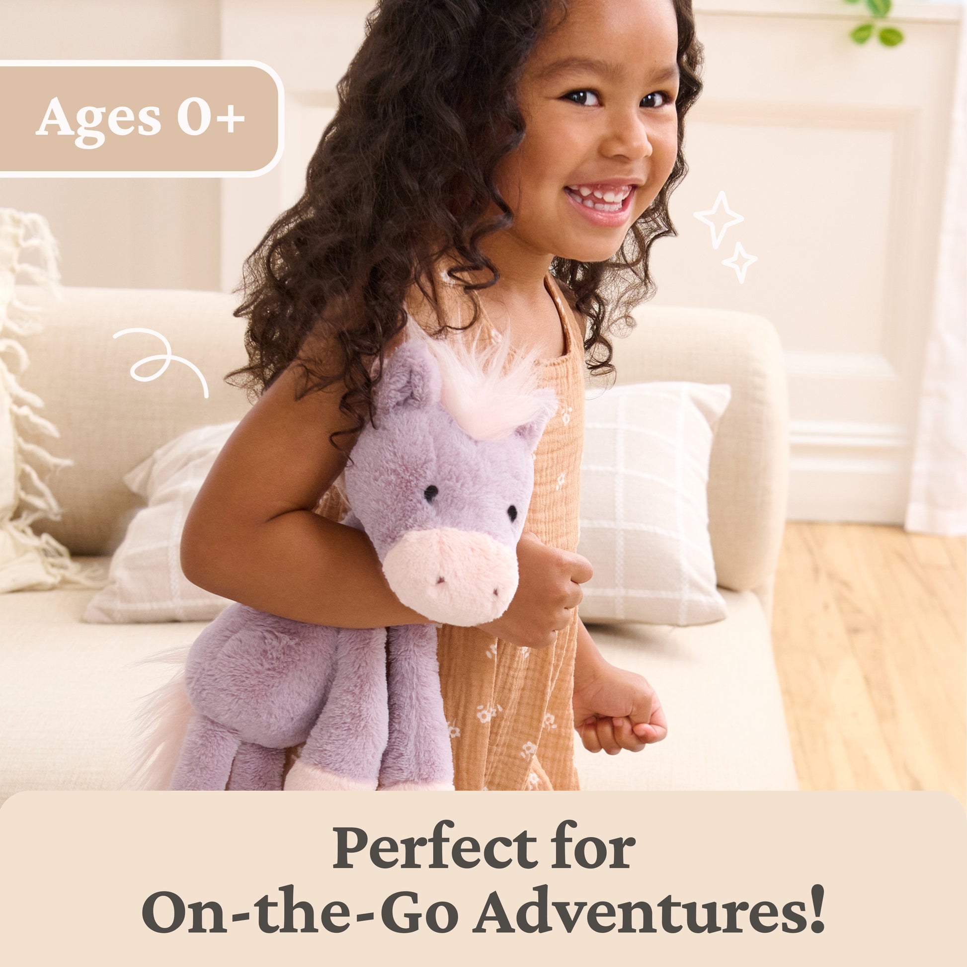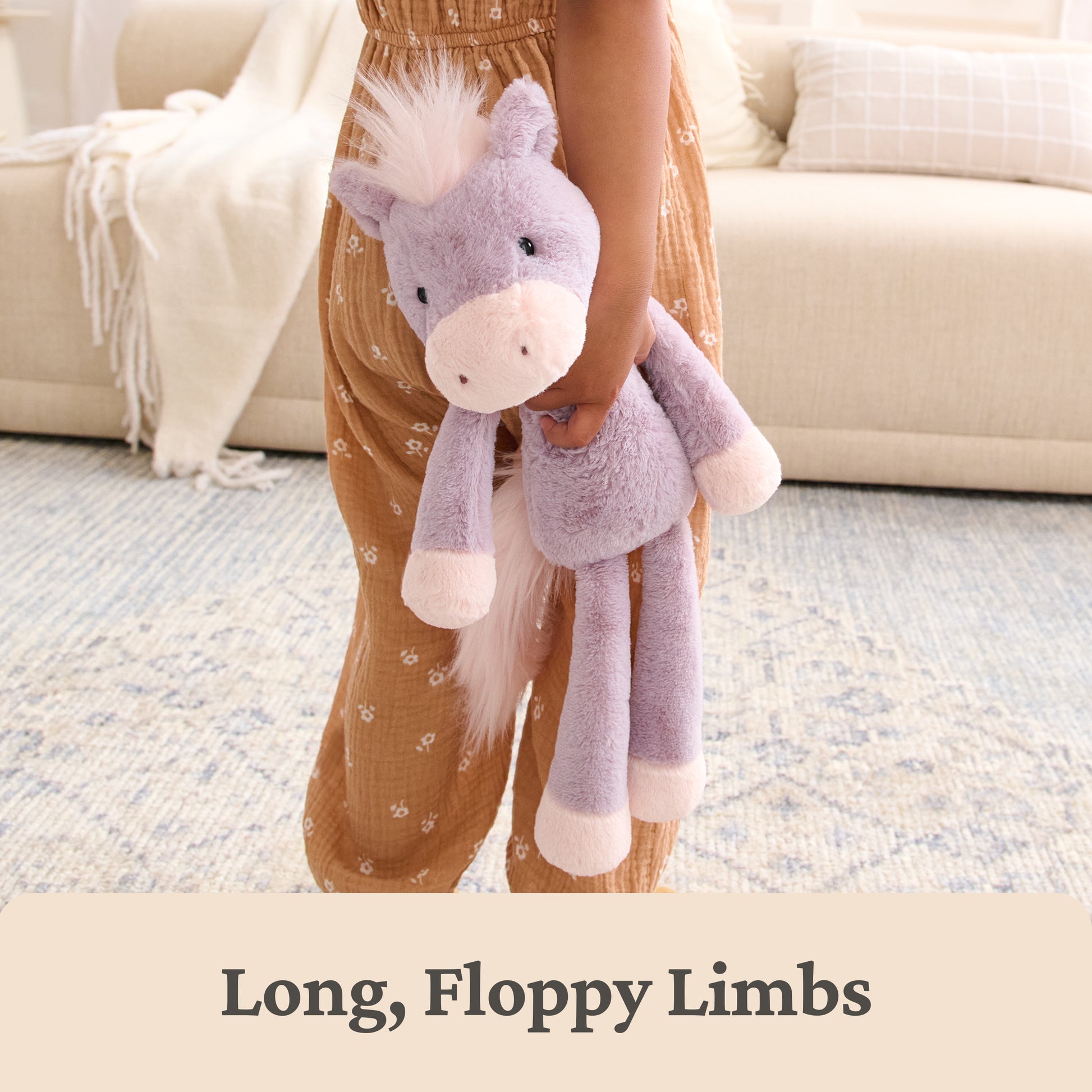 Penni is the mane attraction! This enchantingly cute 15-inch horse stuffed animal is the pasture-loving pal every adventure needs! Penni features a playfully floppy design and super-soft lilac plush with pale carnation-pink accents on her hooves and muzzle. Penni’s short, pointed ears frame a silky pink mane that complements a matching extra-fluffy tail. This pretty pony can’t wait to gallop her way into your heart and swing hoof-in-hand by your side through every playdate!