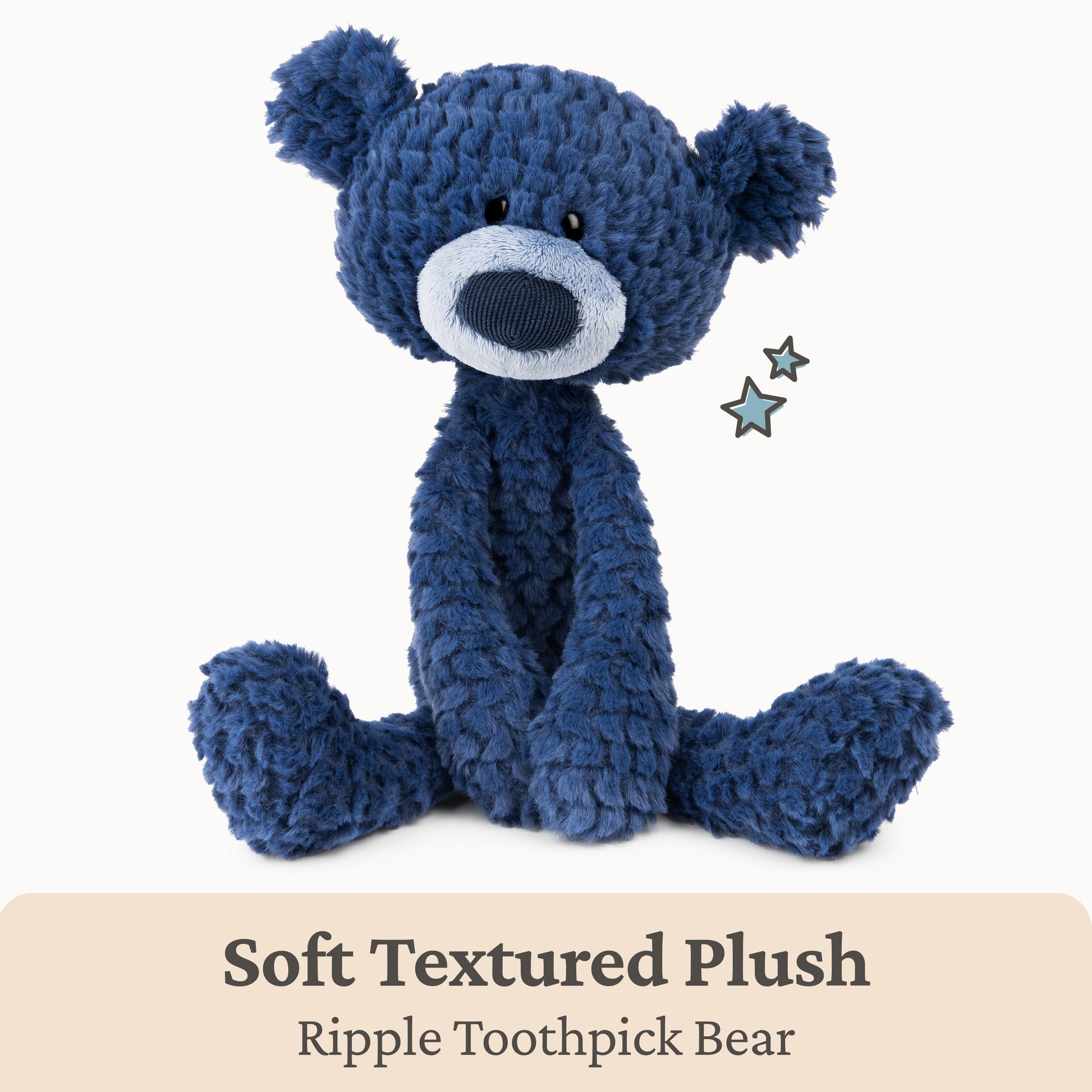 Toothpick has always loved dipping his paws in the water, but sometimes he gets a little carried away. This ocean-inspired bear blends in with his favorite seaside spots and spends his days splish-splashing with friends in the ocean! This 15” version of our classic Toothpick teddy bear features blue delightfully rippled textured plush and a tag-along body with playfully floppy limbs.