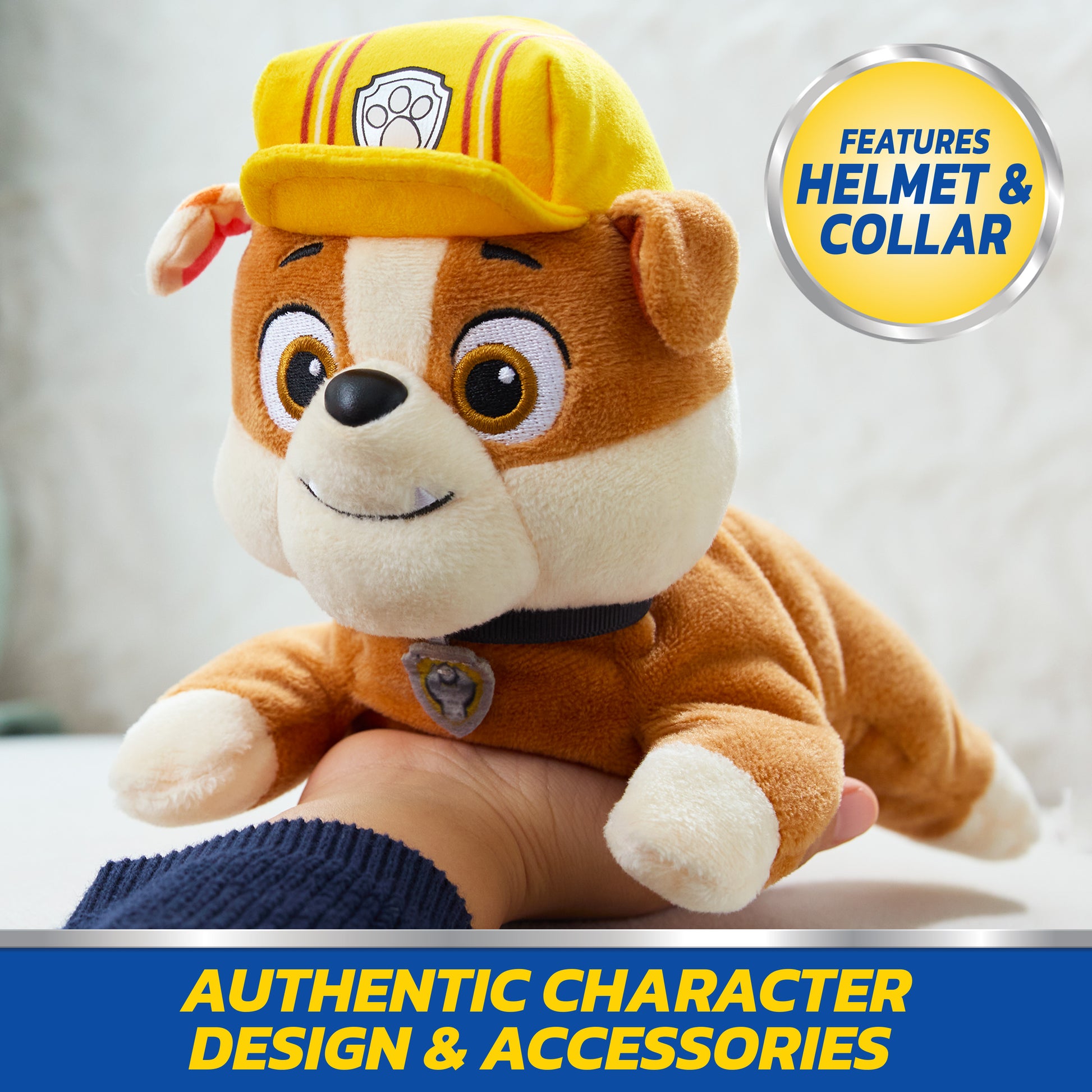 Rubble on the double! Rubble is ready for adventure – or a relaxing snooze – as an adorable lounging plush! This soft, cuddly plush features the funny and sweet PAW Patrol construction pup in his signature yellow helmet and badge, secured by a deep gray satin ribbon collar. Rubble has soft brown plush with cream accents, a plastic nose, and a cuddly, squeezable body weighted with pellets for a fun textural sensory experience. A convenient 8” size also makes on-the-go play easy, so your little one can bring their favorite character (or even the whole pack) to save the day on the next playtime rescue mission! Collect them all, including Chase, Skye, Marshall, and Rubble beanbag styles.