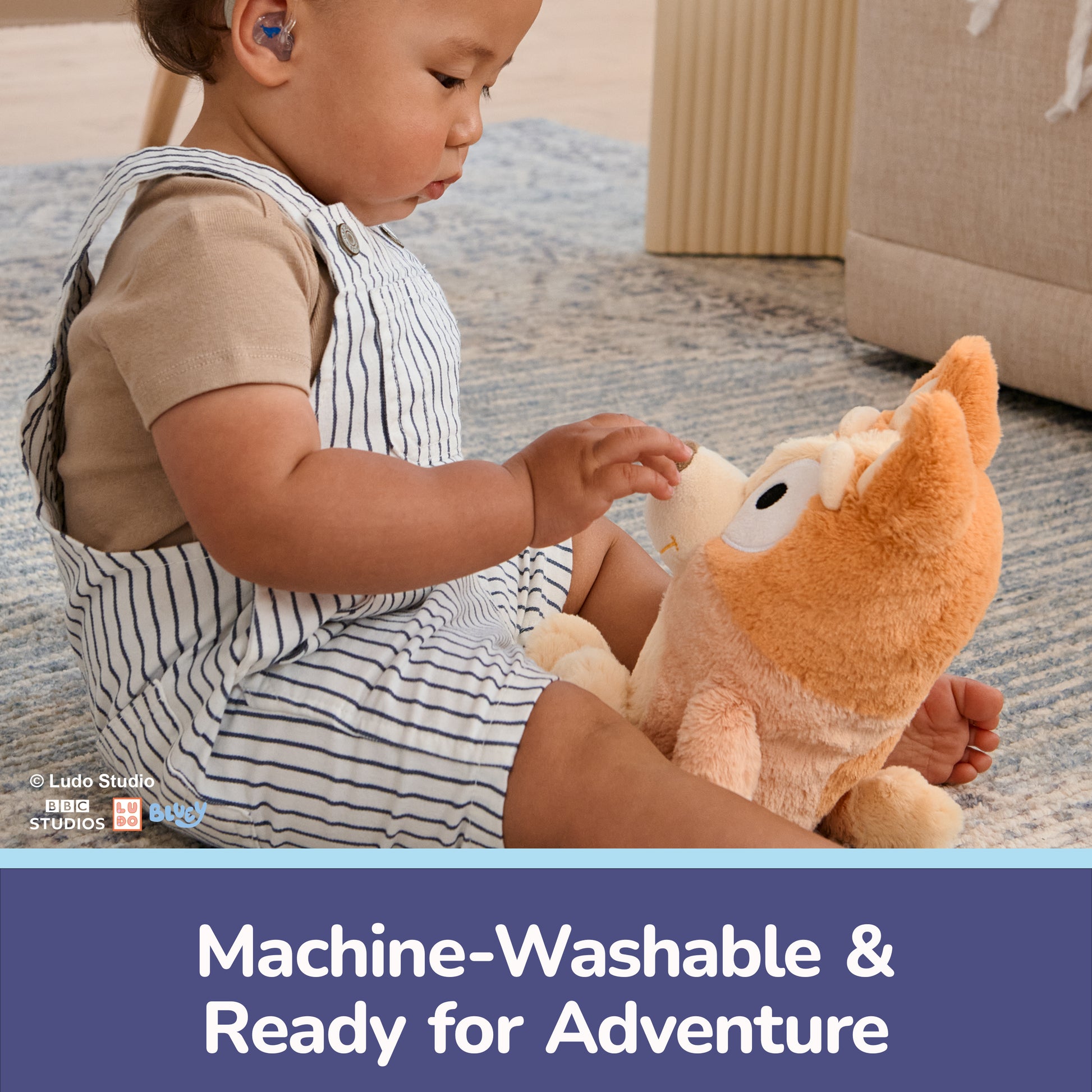 Bring the fun, colorful world of Bluey home with the GUND Sustainably Soft Bluey plush! This 13” stuffed animal boasts luxe, soft plush and true-to-show-styling that brings the lovable Australian Blue Heeler to life. We proudly craft our Sustainably Soft collection with 100% recycled fabrics, from fiber filling and thread to using only pre-consumer recycled beads. Here, Bingo, Bluey’s little sister, is shown with her pastel orange plush, pointed ears, and familiar happy, wide-eyed expression with bold eyebrows and a big embroidered smile. Floppy arms and legs complement Bingo’s huggably soft, round body. She also has a fluffy tail that keeps her balanced upright and display-ready while seated. At 13” from head to foot (8” seated), Bingo is sized for snuggles and on-the-go play for any adventurer!