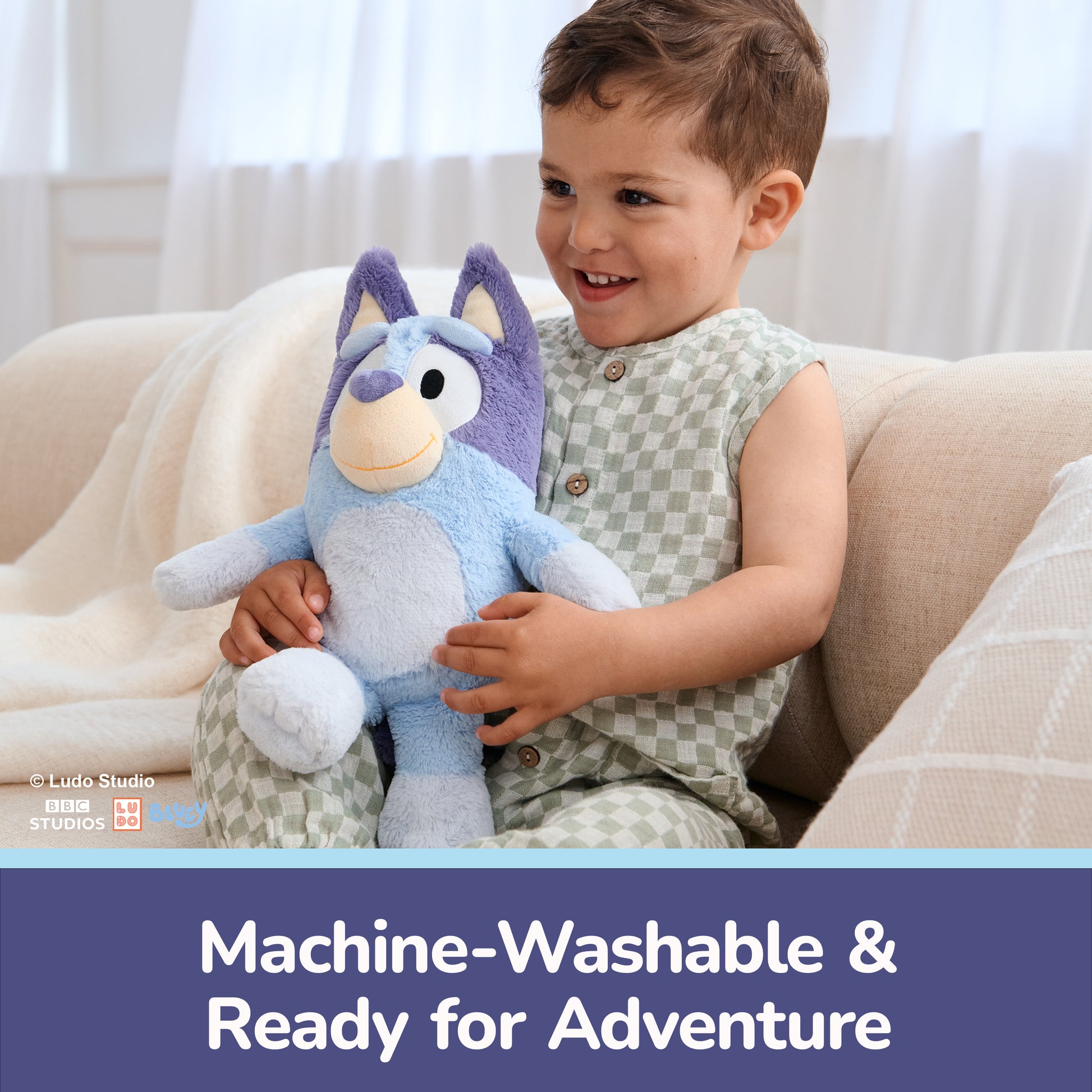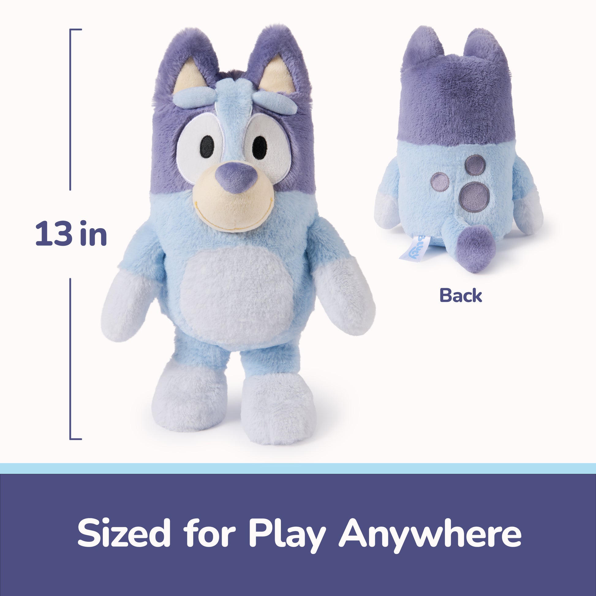 Bring the fun, colorful world of Bluey home with the GUND Sustainably Soft Bluey plush! This 13” stuffed animal boasts luxe, soft plush and true-to-show-styling that brings the lovable Australian Blue Heeler to life. We proudly craft our Sustainably Soft collection with 100% recycled fabrics, from fiber filling and thread to using only pre-consumer recycled beads. Here, Bluey is shown with her vibrant blue plush, pointed ears, and familiar happy, wide-eyed expression with bold eyebrows and a big embroidered smile. Floppy arms and legs complement Bluey’s huggably soft, round body. Her back features embroidered spots, and her fluffy tail keeps her balanced upright and display-ready while seated. At 13 inches from head to foot (8” seated), this stuffed animal is sized for snuggles and on-the-go play for any adventurer!