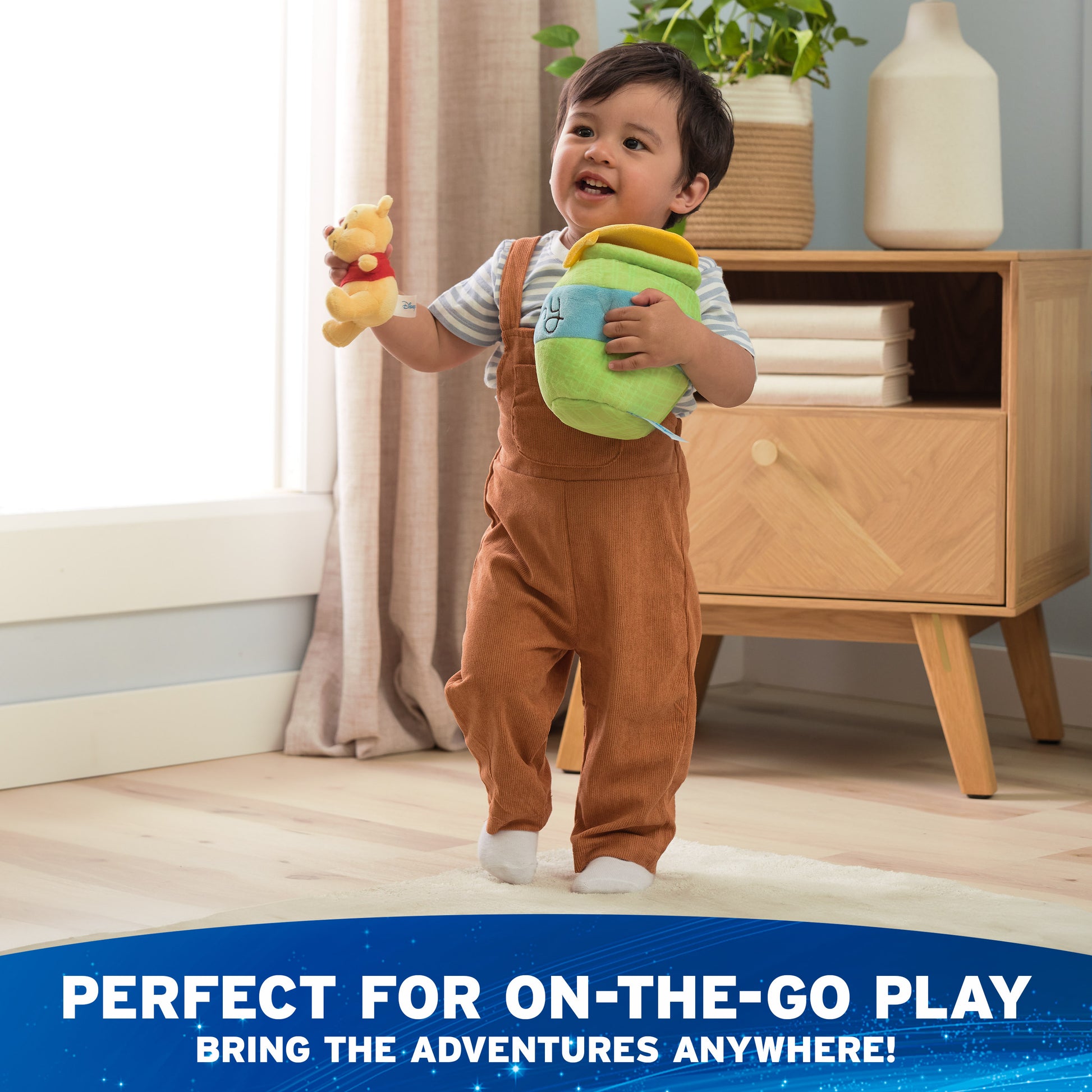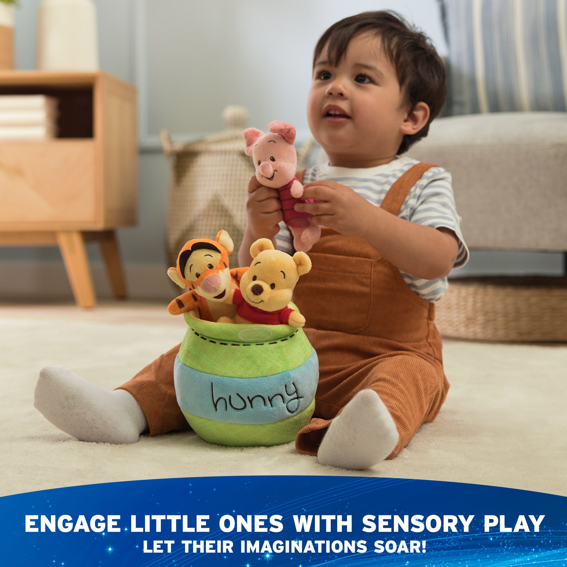 When it’s time for fun, Winnie the Pooh and all his friends will be waiting! This silly ol’ bear is the whimsical, loyal, and cuddly pal of Christopher Robin - and now Pooh, Tigger, and Piglet are here to bring the cuddles home to you! The Winnie the Pooh plush playset is a whimsical and travel-friendly way for little ones to act out their favorite adventures at home while engaging with different sounds and textures with their friends from the Hundred Acre Wood. This adorable four-piece playset contains different sensory-stimulating Pooh bear, Piglet, and Tigger mini plush toys, all designed with special features: the soft 4” Winnie the Pooh plush has a gentle chime rattle inside; the 4” Tigger plush squeaks, and the 3” Piglet delivers a satisfying crinkle with every squeeze. Each plush is designed with authentic Winnie the Pooh character details that collectors and kids alike will love. The 8” honey pot, detailed with adorable “Hunny” embroidery, also transforms into a carrying case with a safe touch-and-close fastener that provides easy cleanup and storage. This innovative playset makes an impressive and timeless gift for fans of all ages, both as décor and to inspire little ones to act out their own imaginative play adventures anywhere.