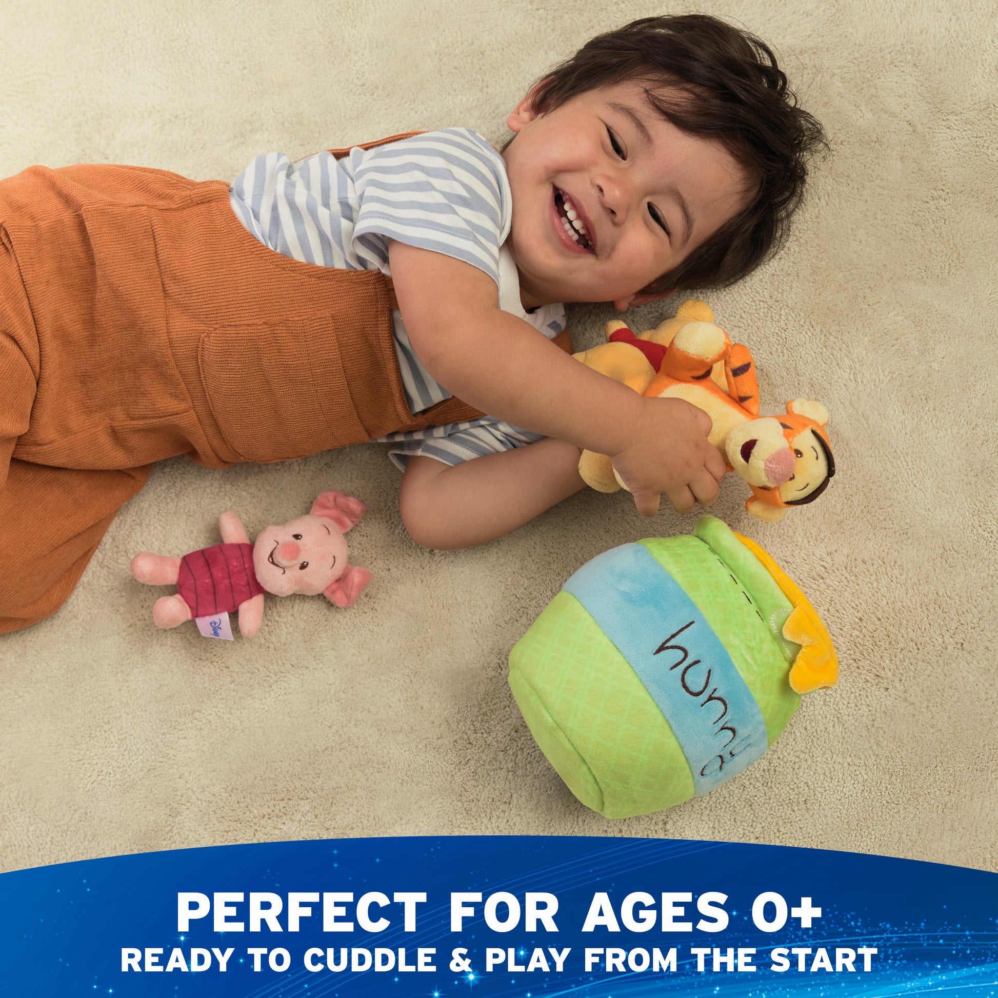 When it’s time for fun, Winnie the Pooh and all his friends will be waiting! This silly ol’ bear is the whimsical, loyal, and cuddly pal of Christopher Robin - and now Pooh, Tigger, and Piglet are here to bring the cuddles home to you! The Winnie the Pooh plush playset is a whimsical and travel-friendly way for little ones to act out their favorite adventures at home while engaging with different sounds and textures with their friends from the Hundred Acre Wood. This adorable four-piece playset contains different sensory-stimulating Pooh bear, Piglet, and Tigger mini plush toys, all designed with special features: the soft 4” Winnie the Pooh plush has a gentle chime rattle inside; the 4” Tigger plush squeaks, and the 3” Piglet delivers a satisfying crinkle with every squeeze. Each plush is designed with authentic Winnie the Pooh character details that collectors and kids alike will love. The 8” honey pot, detailed with adorable “Hunny” embroidery, also transforms into a carrying case with a safe touch-and-close fastener that provides easy cleanup and storage. This innovative playset makes an impressive and timeless gift for fans of all ages, both as décor and to inspire little ones to act out their own imaginative play adventures anywhere.